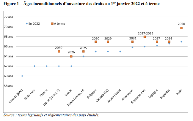 Le COR s'est également penché sur l’âge du taux plein, à savoir l’âge de départ à la retraite considéré comme « normal », qui coïncide avec l’obtention d’une pension à taux plein (sans abattement en lien avec une durée de carrière ou de résidence) : pour n’en citer que quelques-uns, l’âge du taux plein est de 65 ans au Canada et au Japon, de 63 ans et 8 mois pour les salariés qui justifient de 45 années de cotisations ou de 65 ans et 10 mois pour les autres en Allemagne, et à 67 ans aux États-Unis. Dans ces pays, les retraites liquidées avant cet âge subissent un abattement. En France l’âge du taux plein inconditionnel est fixé à 67 ans, mais une condition de durée d’assurance peut dans certain cas permettre d’annuler l’abattement avant cet âge.