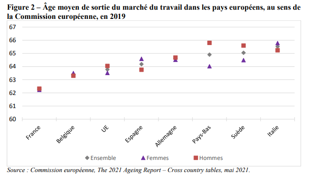 Les Français sont ceux qui partent le plus tôt à la retraite, pour les hommes (62,3 ans) comme pour les femmes (62,2 ans). À l'inverse, les moins bien lotis en la matière sont les hommes néérlandais (64,8 ans), et les italiennes (65,8 ans).