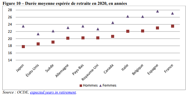 Là encore, la France se distingue des autres pays : les hommes Français peuvent se prévaloir de la plus grande durée espérée de retraite (23,4 ans). Pour les femmes, la durée espérée de retraite est plus élevée en Espagne (27,7 ans), suivie de près par la France (27,1 ans). À l’opposé se trouvent le Japon et les États-Unis pour les hommes : la durée moyenne de versement de la retraite s’élève respectivement à 15,5 ans et 16,4 ans. Pour les femmes, les durées espérées de retraite sont les plus faibles aux États-Unis et en Suède, respectivement 21,3 ans et 22,1 ans.