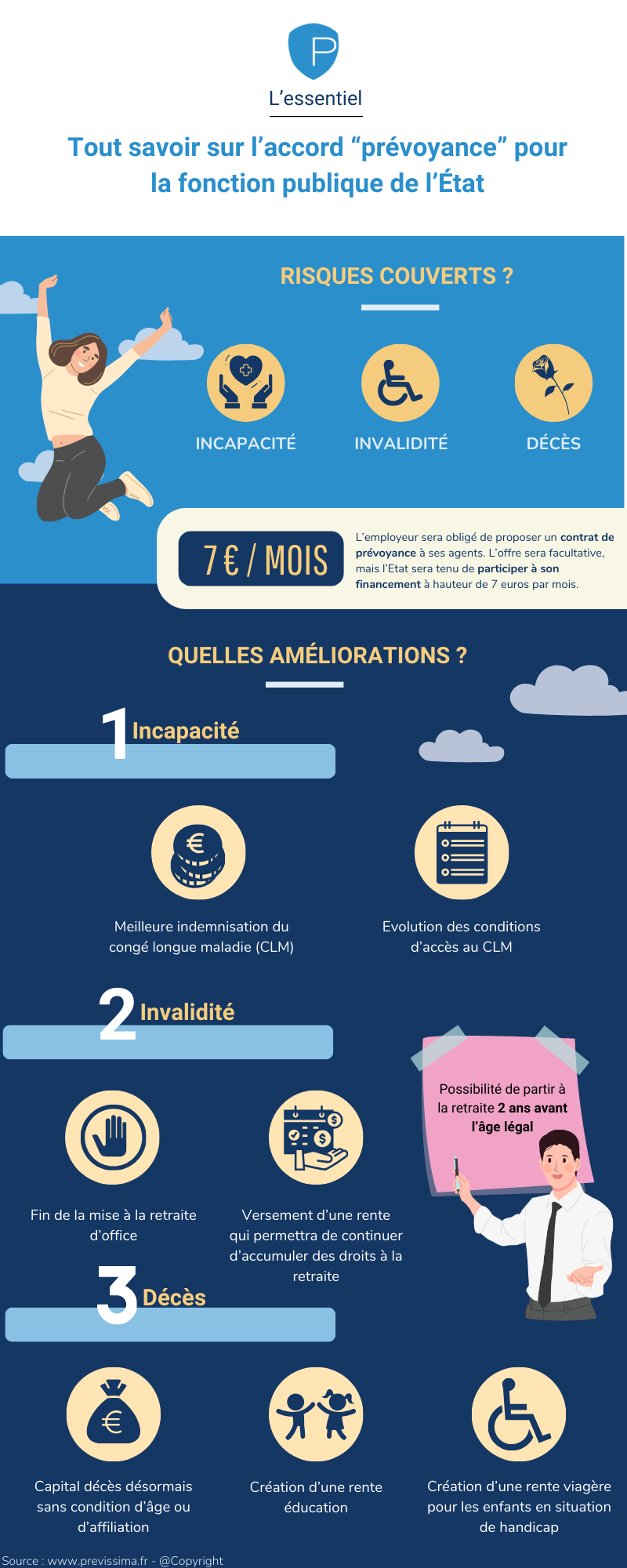 Pour compléter votre couverture et réduire votre reste à charge, l’accord prévoit que l’Etat aura l’obligation de vous proposer, à compter du 1er janvier 2025, un contrat complémentaire de qualité en prévoyance, couvrant les risques incapacité, invalidité et décès.