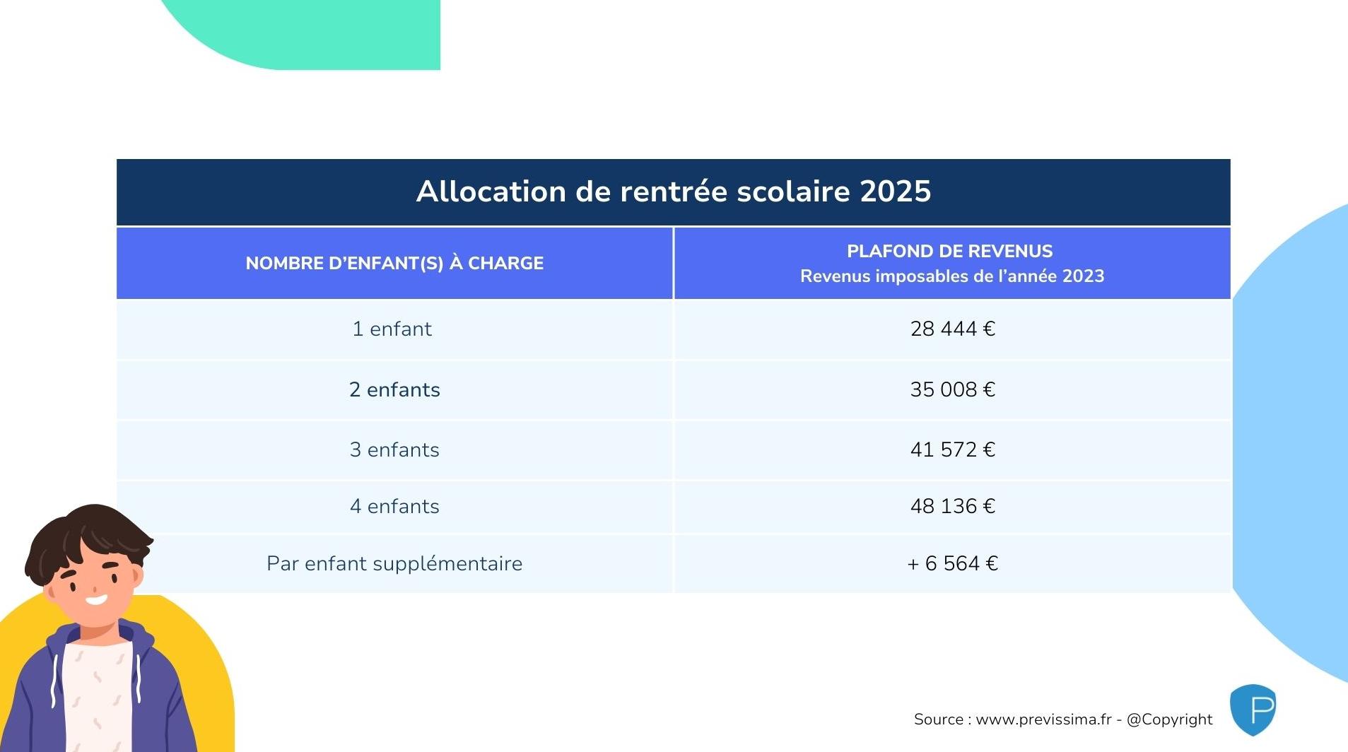 Les plafonds de ressources à ne pas dépasser pour bénéficier de l’allocation de rentrée scolaire dépendent de votre nombre d’enfants à charge. Ainsi, vous bénéficierez de l’ARS lors de la rentrée 2025 si vos revenus ne dépassent pas :