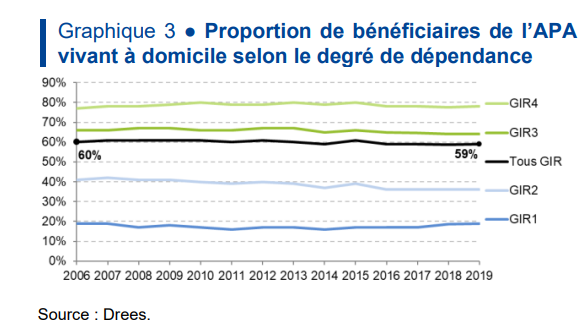 Dans une récente actualité, la Sécurité sociale indique que la proportion de bénéficiaires de l’APA vivant à domicile a augmenté de 5 points entre 2003 et 2006. Depuis, elle s’est ensuite stabilisée à 59 %. Elle explique cette évolution par le doublement du nombre de bénéficiaire relevant du GIR 4, c’est-à-dire ceux présentant une faible perte d’autonomie : il s’agit des personnes n’assumant pas seules leurs « transferts » mais qui, une fois levée, peut se déplacer à l’intérieur de son logement, et qui a besoin d’aides pour la toilette et l’habillage ; et des personne n’ayant pas de problèmes locomoteurs mais qui doivent être aidées pour les soins corporels et les repas.