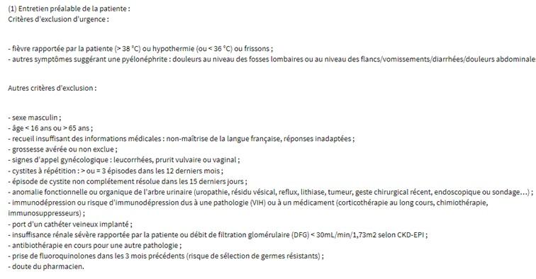 - Pour les cystites, sont exclues les femmes âgées de moins de 16 ans ou de plus de 65 ans, les personnes présentant de la fièvre ou une hypothermie, les femmes enceintes, etc.