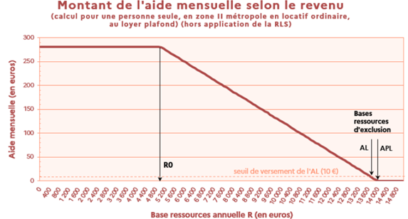 Le guide montre cependant un graphique instructif qui permet de constater que le montant de l’aide mensuelle est dégressif en fonction du revenu :