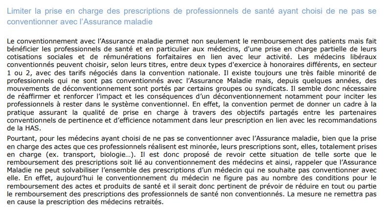 Visiblement, il ne s’agirait pas là d’une suppression totale de la prise en charge mais d’une réduction ; en effet le rapport (p.235) indique : « L’Assurance maladie ne peut solvabiliser l’ensemble des prescriptions d’un médecin qui ne souhaite pas conventionner avec elle. Il serait donc pertinent de prévoir de réduire tout ou partie le remboursement des prescriptions de professionnels de santé non conventionnés », est-il souligné.