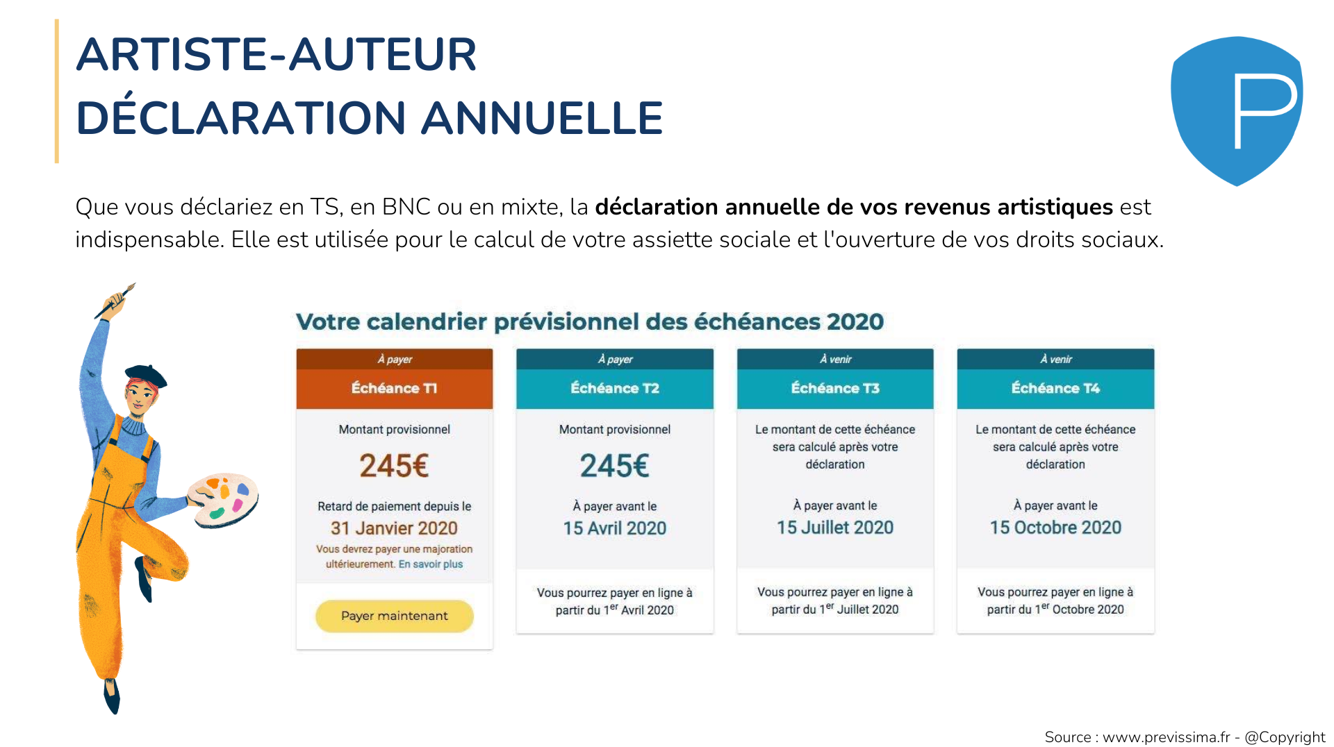 Que vous déclariez en TS, en BNC ou en mixte, la déclaration annuelle de vos revenus artistiques est indispensable. Elle est utilisée pour le calcul de votre assiette sociale et l'ouverture de vos droits sociaux.