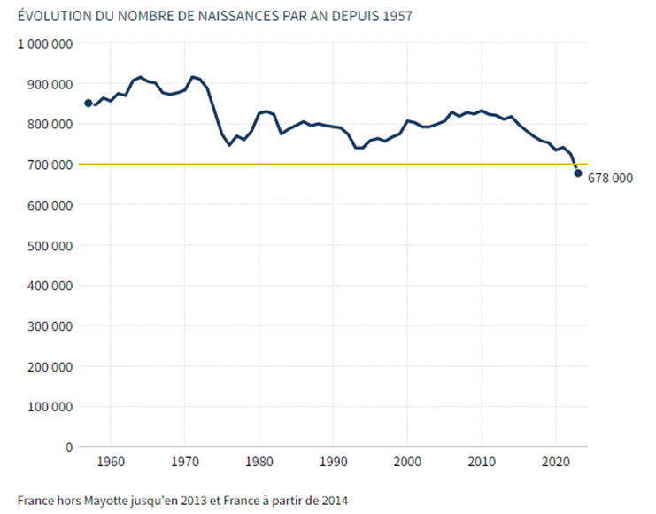 Ce nombre historiquement bas s’expliquerait notamment par L’indicateur conjoncturel de fécondité qui s’établit à 1,68 enfant par femme en 2023, après 1,79 en 2022. Depuis la Seconde Guerre mondiale, cet indicateur n’a jamais été aussi bas (hormis en 1993 et 1994).