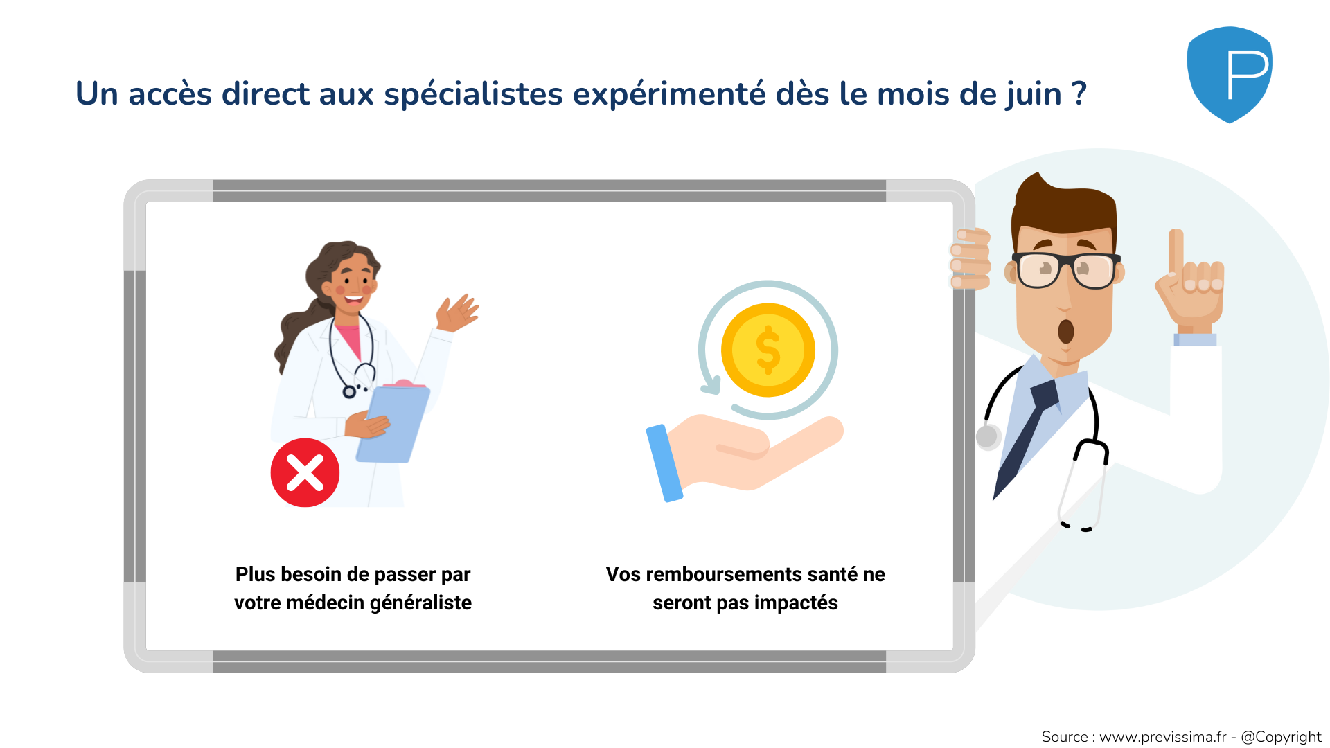 Le Gouvernement a en effet annoncé vouloir expérimenter l'accès direct aux médecins spécialistes. Autrement dit, vous pourrez consulter un spécialiste sans passer par votre médecin généraliste. Et, votre remboursement ne sera pas impacté.