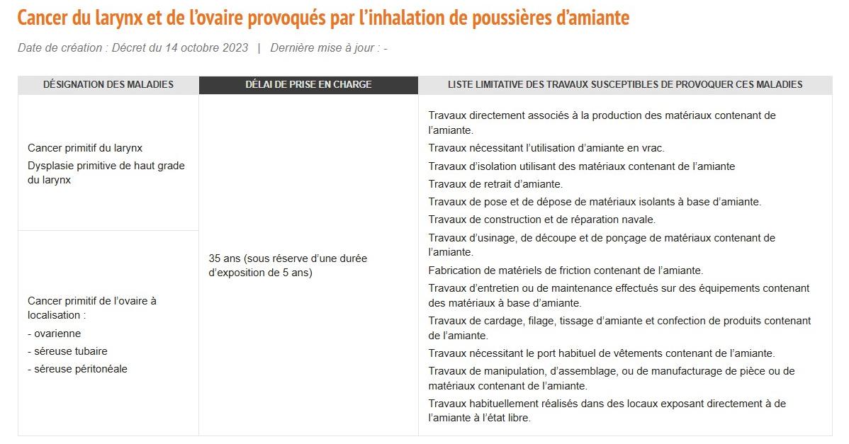 - Colonne 3 : liste des travaux susceptibles de provoquer l’affection