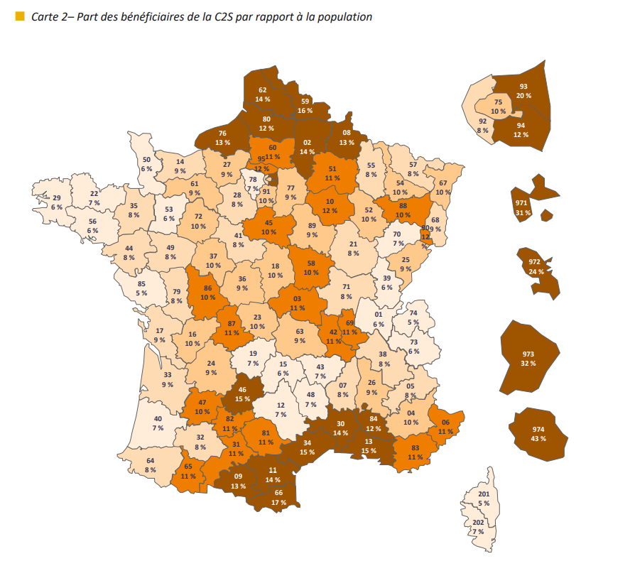 En métropole, la part la plus élevée de bénéficiaires de la C2S est de 20 % en Seine-Saint-Denis, avec 326 000 bénéficiaires. Ce département connaît parallèlement le taux de pauvreté le plus élevé de métropole (28 %).