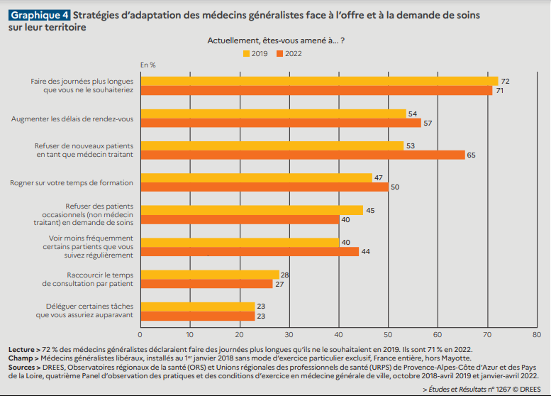 - 65% refusent de prendre en charge de nouveaux patients en tant que médecin traitant, alors qu’ils étaient 53% en 2019 ;