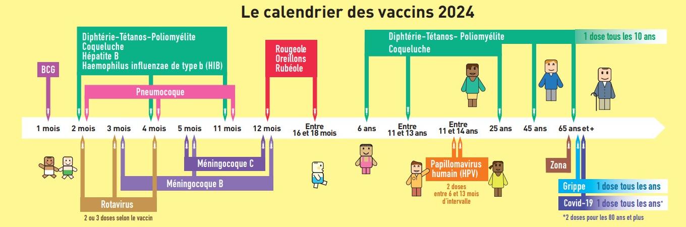 Le saviez-vous ? Le ministère de la Santé a établi un calendrier vaccinal qui fixe les vaccinations a réaliser en fonction de l’âge. Ce calendrier est actualisé chaque année. Découvrez ci-dessous le calendrier vaccinal 2024 :
