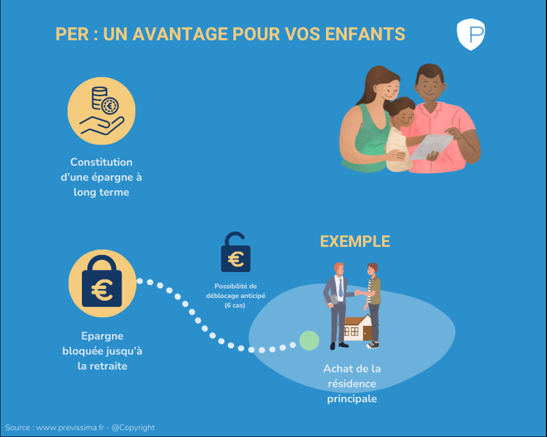 Cela lui permet de se constituer un capital qu’il pourra débloquer à l’âge de la retraite ou avant s’il se trouve dans l’un des 6 cas de déblocage anticipé prévus par la loi. Vous pourrez donc l’aider, grâce au PER, à acquérir sa résidence principale.
