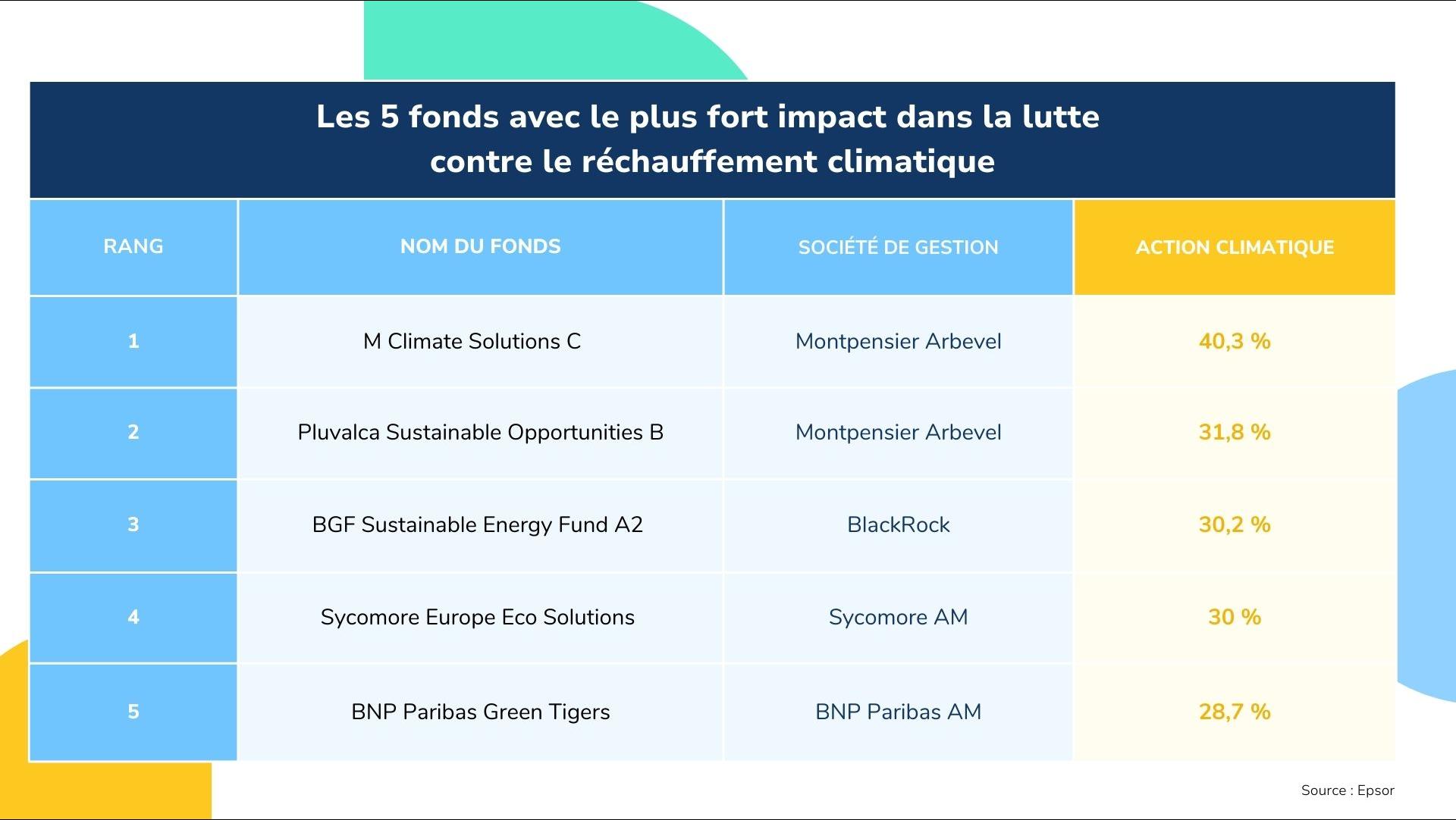 Epsor a attribué une « note d’impact » aux fonds ISR en fonction de plusieurs critères : notation ESG, empreinte carbone, contribution à la transition énergétique et exposition aux secteurs controversés (OGM, pesticides, huile de palme, etc.).