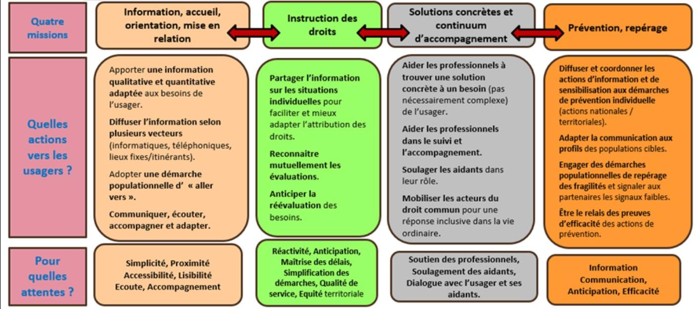 Ce véritable guichet unique de l’autonomie visera à simplifier le parcours des usagers, personnes en perte d’autonomie, personnes en situation de handicap et leurs aidants, sur toute question relative à la perte d’autonomie. Ce dispositif aura les missions suivantes :