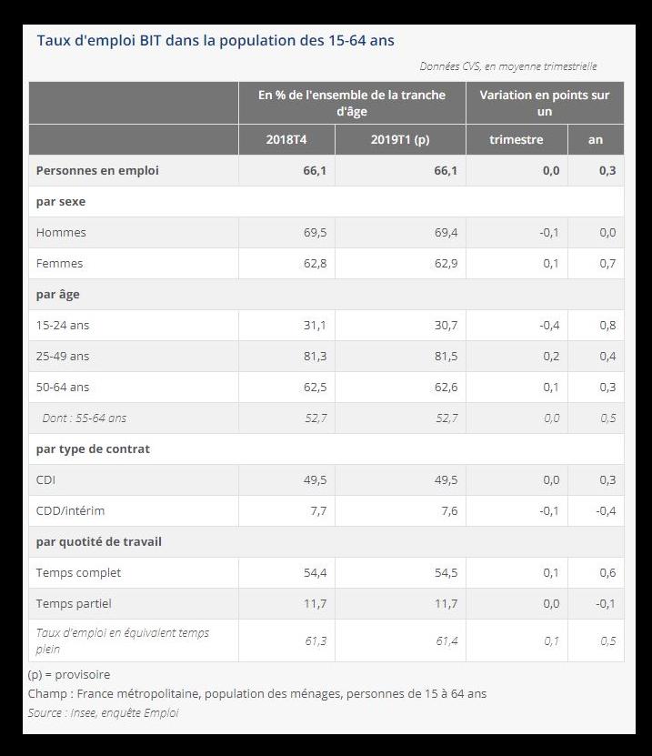 Début 2019, le taux d’emploi des 15-64 ans est stable (66,1 %), soit le niveau le plus haut depuis 1980. Sur ce premier trimestre, le taux d'emploi des personnes d'âge intermédiaire (25-49 ans) augmente légèrement (+0,2 point), celui des séniors est quasi stable. En revanche, le taux d'emploi des 15-24 ans diminue nettement (–0,4 point).
