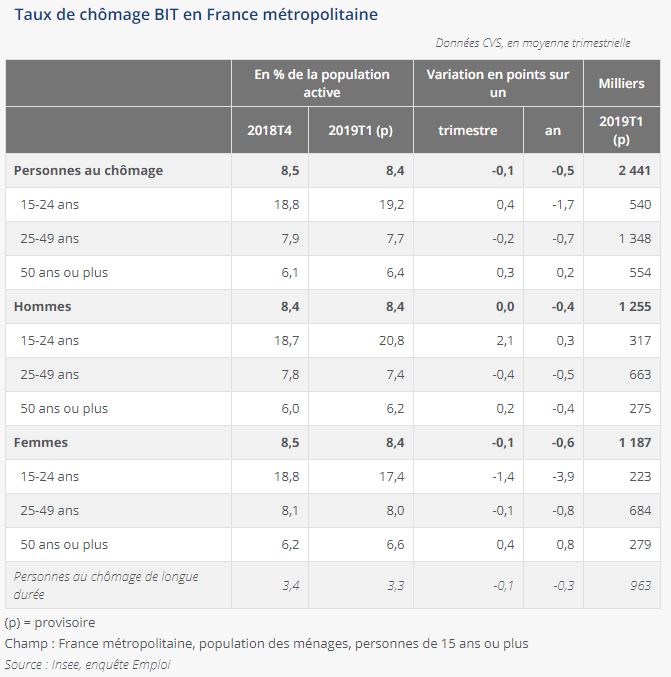 Selon les chiffres publiés par l’INSEE, en France métropolitaine, le nombre de chômeurs diminuent de 19 000 sur le premier trimestre 2019 pour s’établir à 2,4 millions de personnes, soit un taux à 8,4 % de la population active.