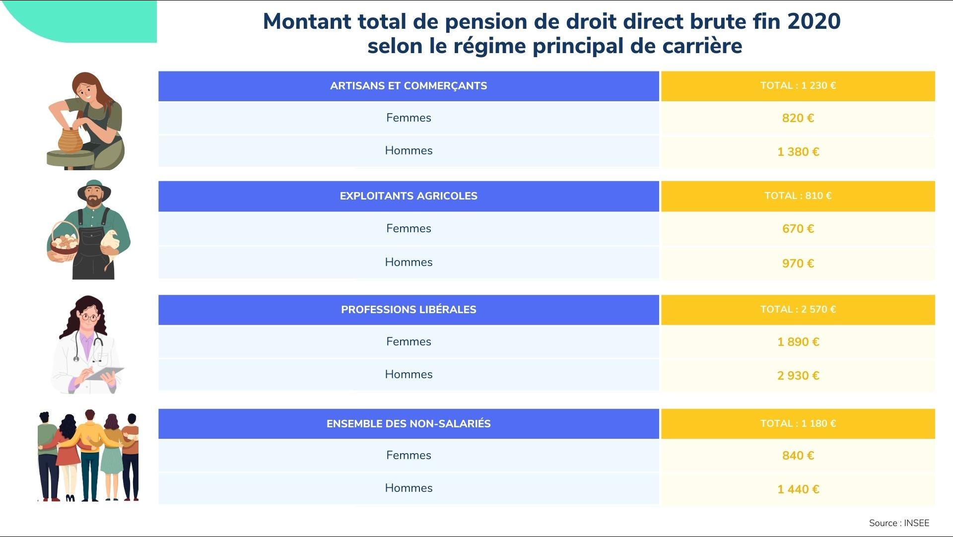 L’Insee met également en évidence un écart significatif entre les pensions des femmes et celles des hommes. Chez les indépendants, les femmes perçoivent en moyenne une pension nettement inférieure à celle des hommes.