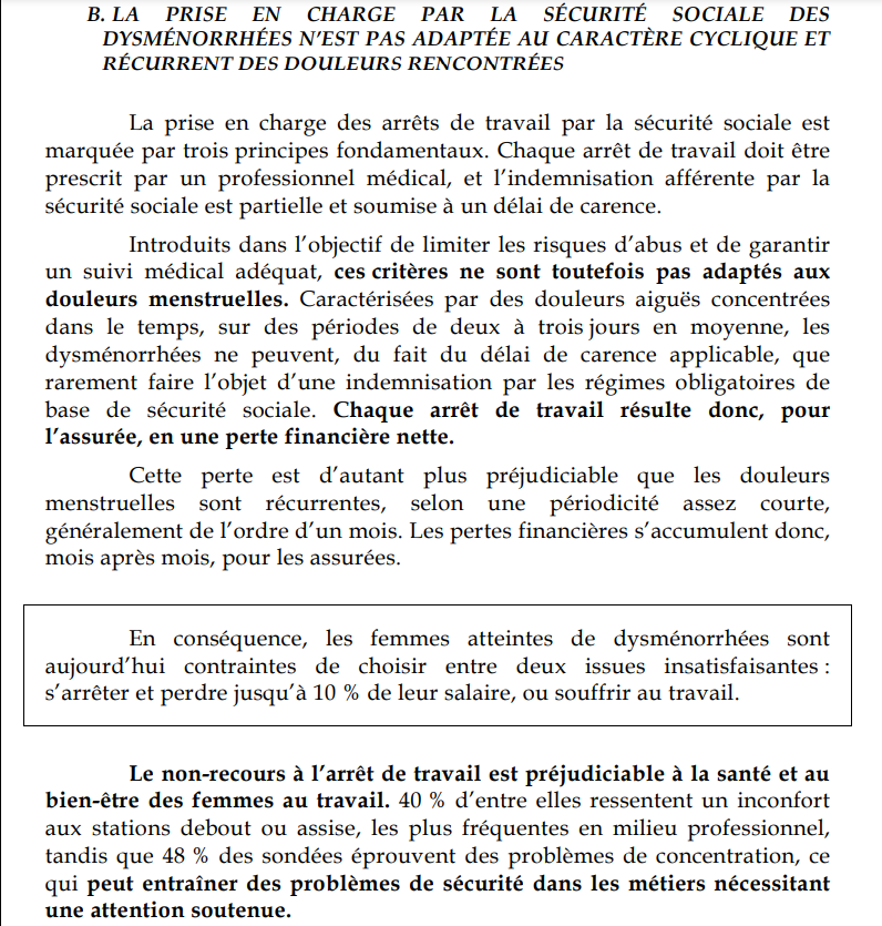 Selon un rapport sénatorial en date de février 2024, la prise en charge de la dysménorrhée par la Sécurité sociale est actuellement inadaptée, en raison de son caractère cyclique et récurrent.