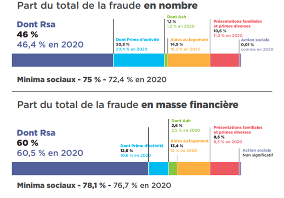 La fraude au minima sociaux est la plus fréquente et représente 75 % des situations de fraude individuelle, dont 46 % relève de la fraude au revenu de solidarité active (RSA) et 20,8 % à la prime d’activité. En masse financière, la fraude au RSA pèse 60 % de la part totale.