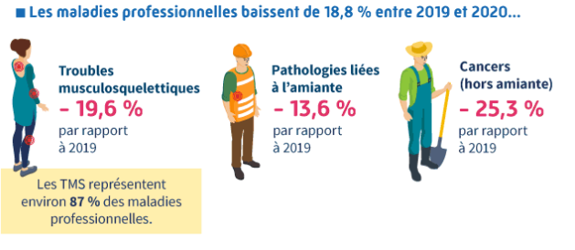 À l’instar des accidents du travail et accidents de trajet, les maladies professionnelles ont baissé de 18,8 % entre 2019 et 2020. Comme les années précédentes, les troubles musculo-squelettiques demeurent à l’origine de 87 % des maladies professionnelles déclarées.