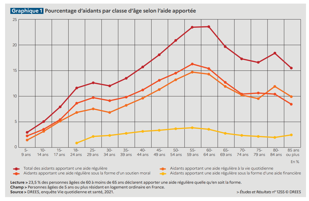 Une étude de la DREES chiffre pour la première fois le nombre de proches aidants en France : 8,8 millions d’adultes et 0,5 million de mineurs âgés de 5 ans ou plus sont aidants, soit un adulte sur six, et un mineur sur vingt. Quelle aide apportent-ils ? Qui sont-ils ?
