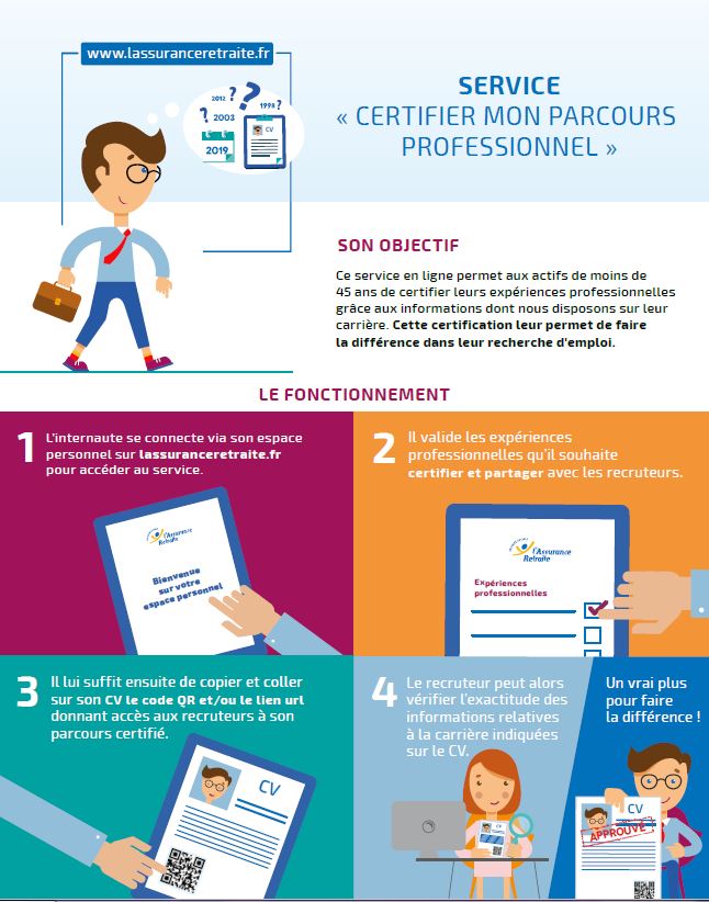 Issu du Hackathon #LabRetraite, organisé par des étudiants et les équipes de la Caisse nationale d'assurance vieillesse (CNAV), l’Assurance retraite lance un service en ligne de certification de parcours professionnel. Il s’agit d’un service dédié aux assurés sociaux de moins de 45 ans qui permet de certifier leurs expériences professionnelles grâce aux informations dont l’Assurance retraite dispose sur leur carrière.