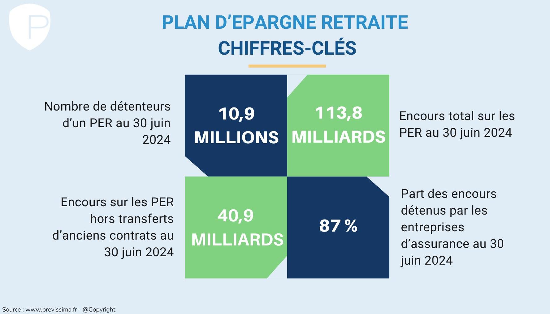 Enfin, fin juin 2024, 10,9 millions de personnes détenaient un PER pour un encours de 113,8 milliards d’euros. Hors transferts d’anciens contrats, l’encours s’élève à 40,9 milliards d’euros. Les entreprises d’assurance représentaient à cette date 87 % de ces encours.