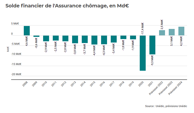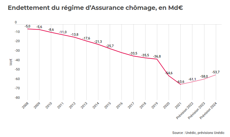 Pour faire face à la crise sanitaire, la dette de l’Unédic s’était particulièrement creusée en 2020 et 2021. Les excédents qui seraient constatés permettraient au régime d’engager une réduction de sa dette, qui s’élevait à -63,6 milliards d’euros à la fin 2021. Selon la présidente de l’Unédic Patricia Ferrand, « les excédents permettraient une trajectoire de désendettement de l’ordre de 10 milliards en trois ans ».