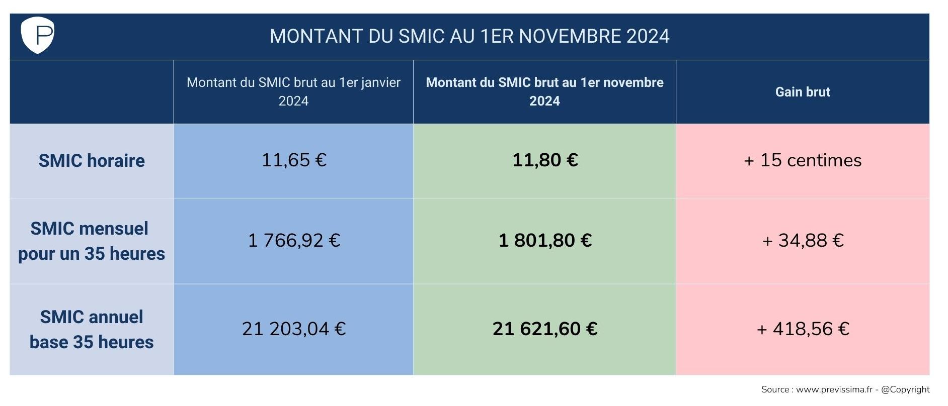 - Le SMIC mensuel brut devrait s’établir à 1 801,80 € brut pour un salarié travaillant 35 heures par semaine, soit une hausse de 34,88 € par mois ;