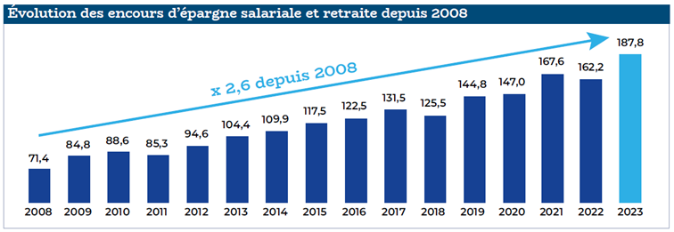 L’épargne salariale et retraite a le vent en poupe. À la fin 2023, l’encours est de 188 milliards d’euros, un record. La collecte affiche ainsi une dynamique positive et un nombre toujours croissant d’entreprises équipées. Les mesures incitatives de ces dernières années (loi Macron, loi Pacte, loi ASAP) semblent avoir porté leurs fruits.