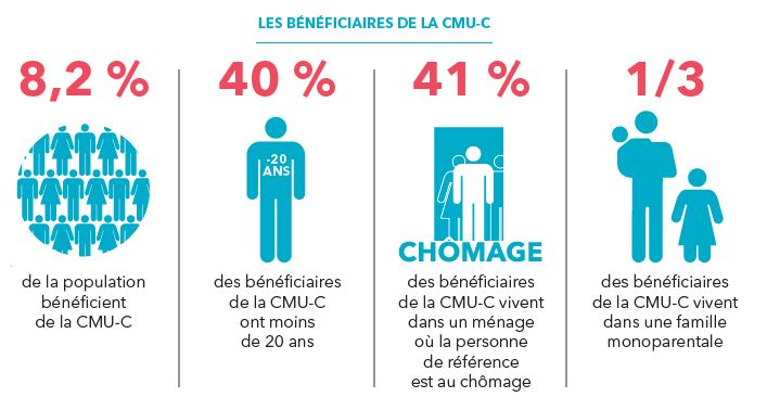 64 millions de personnes sont couvertes par une complémentaire santé, soit plus de 95 % de la population. Parmi elles, 5,5 millions de personnes bénéficient d’une couverture maladie universelle complémentaire (CMU-C), 40 % de ces bénéficiaires ont moins de 20 ans et 41 % sont au chômage.