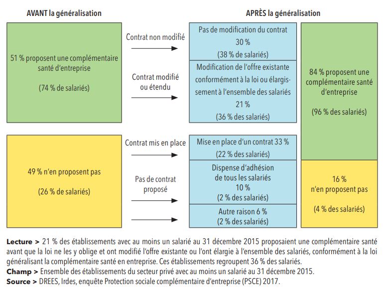 Alors qu’en 2014, sept salariés sur dix étaient couverts par un contrat collectif, en 2017, ils sont près de 9 sur 10. Cette augmentation intervient après la réforme de la généralisation de la complémentaire santé d’entreprise en 2016.
