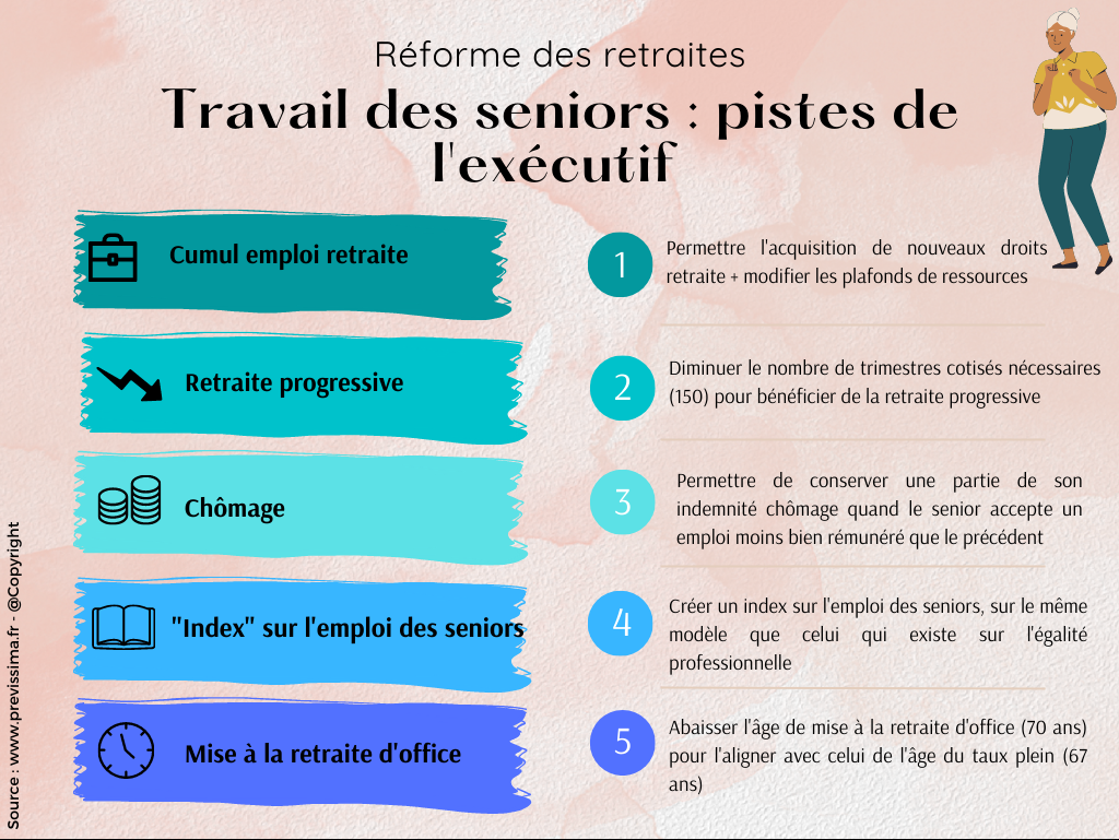 - Abaisser de 3 ans l’âge de la mise à la retraite d’office : à la demande du patronat, l’exécutif envisage cette piste afin d’aligner l’âge de la retraite d’office (aujourd’hui fixé à 70 ans) sur l’âge du taux plein (67 ans)