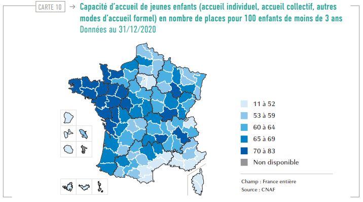 Selon les départements, les disparités sont importantes, avec un rapport de 1 à 7 entre le département le mieux et le moins bien doté : Mayenne, avec 83,1 places pour 100 enfants et Guyane, avec 11,1 places pour 100 enfants.