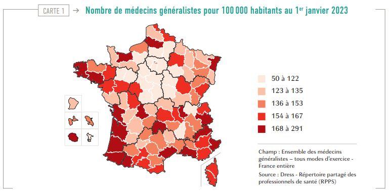 Par ailleurs, la densité moyenne de médecins généralistes pour 100 000 habitants est passée de 151 en janvier 2020 à 147 en janvier 2023, avec des disparités territoriales marquées, accentuant les difficultés d'accès en milieu rural, où un médecin libéral couvre en moyenne 30 km² contre 5 km² en milieu urbain.
