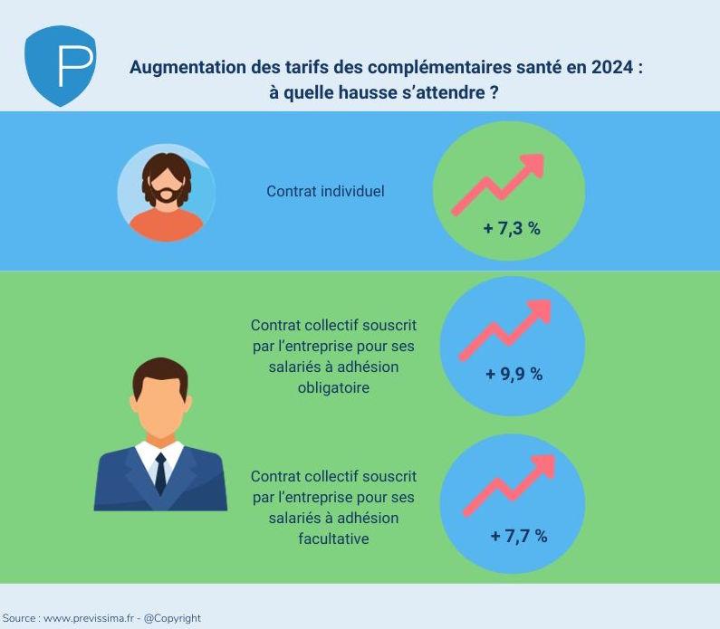 - Et de +7,7 % à +9,9 % pour les contrats collectifs, c’est-à-dire les contrats souscrits par les employeurs au profit de leurs salariés. Les cotisations sont alors prises en charge à 50 % par l’employeur, à minima.