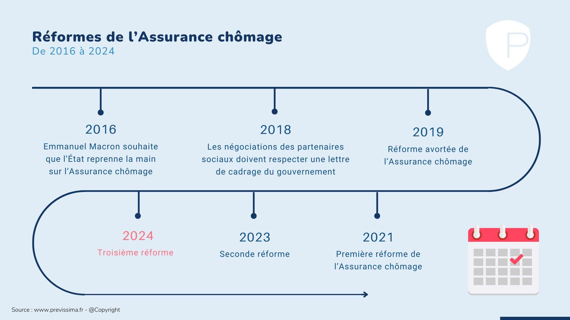 - 2024 : Gabriel Attal annonce une nouvelle réforme de l’assurance chômage, qui devrait être effective au 1er juillet 2024. La piste envisagée à ce stade est la diminution de la durée d’indemnisation.