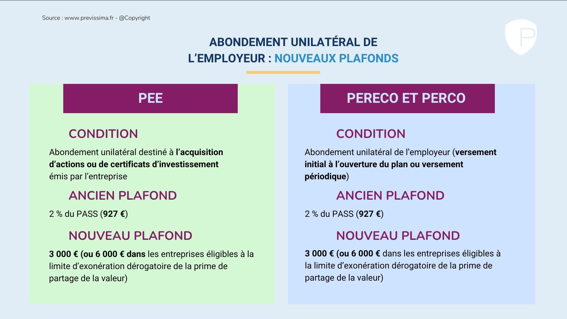 Employeurs, les différents plafonds pour les abondements unilatéraux (c’est-à-dire ceux qui sont possibles même en l’absence de versements du salarié) au PEE, PERECO ou PERCO sont réhaussés !
