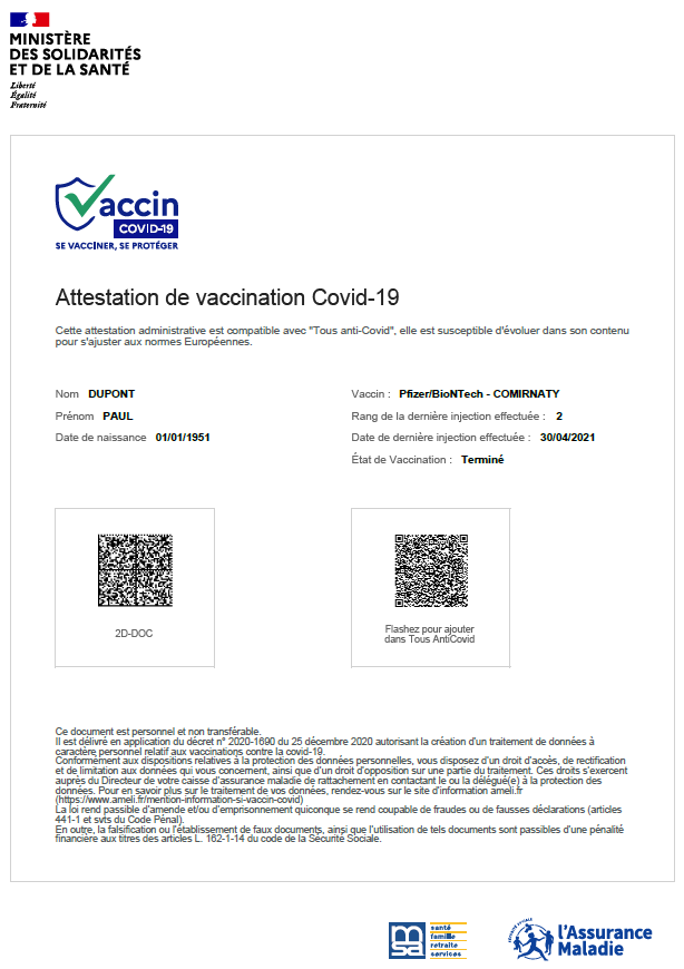 Depuis lundi 3 mai 2021, les personnes vaccinées contre la Covid-19 peuvent déjà demander au professionnel de santé une attestation de vaccination dite « certifiée » au format papier. Une synthèse vaccinale pouvait déjà être remise par le professionnel de santé à la personne vaccinée via un téléservice appelée Vaccin Covid. C’est sur ce même téléservice que l’attestation de vaccination contre la Covid-19 sera disponible. Elle contient les informations suivantes :