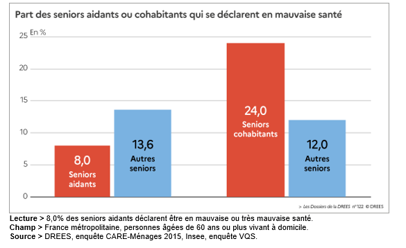 Par ailleurs, l’étude révèle que les seniors cohabitant avec une personne dépendante se déclarent plus fréquemment en mauvaise ou en très mauvaise santé (24 %) que les autres seniors (12 %).