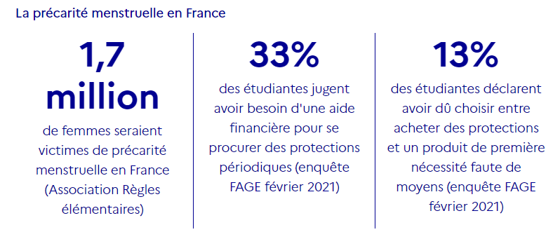 44 % des jeunes femmes de 18 à 24 ans et 31 % des femmes menstruées de 18 à 50 ans se disent concernées par la précarité menstruelle en raison notamment des coûts élevés des protections périodiques pouvant priver certaines femmes de leur utilisation, ou différer leur renouvellement régulier, ce qui peut affecter leur santé (à travers notamment le syndrome du choc toxique).