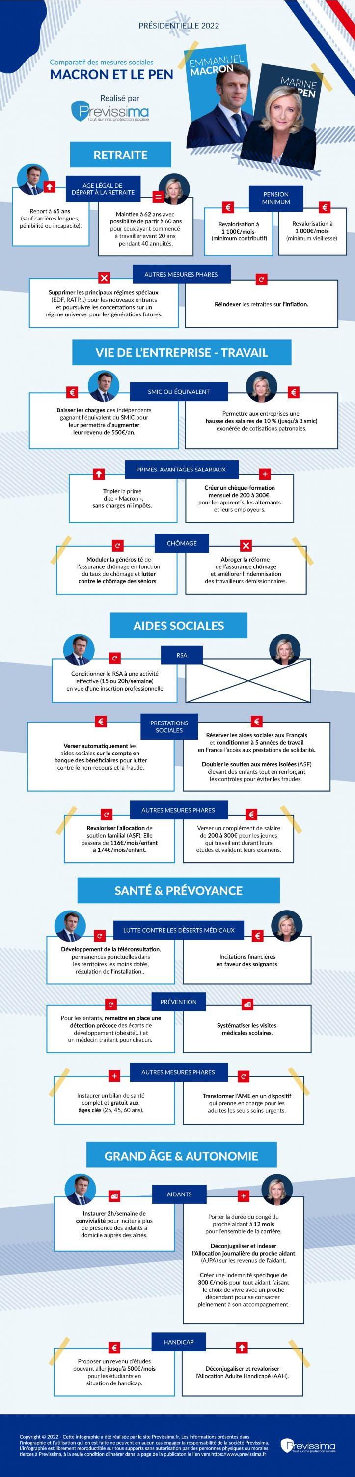 Présidentielle 2022 : comparatif des programmes d’Emmanuel Macron et de Marine Le Pen en matière de protection sociale (Infographie)