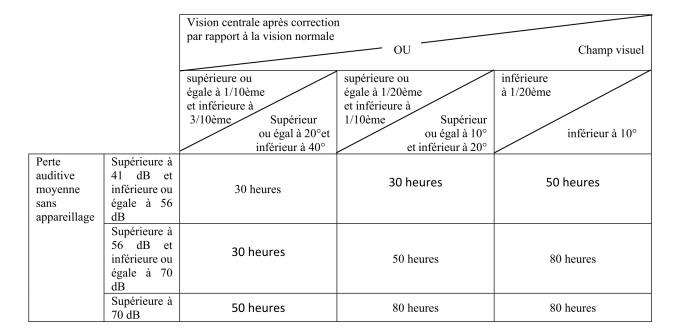 Néanmoins, ces dernières ont de quoi se féliciter : il ne sera bientôt plus question pour les personnes atteintes de ce double handicap de choisir entre un forfait de PCH « surdité » ou « cécité » puisque le décret propose 3 niveaux d’accompagnement (30, 50 et 80h) définis à partir de critères médicaux d’évaluations de la vision et de l’audition. Ces critères sont repris dans le tableau ci-dessous :