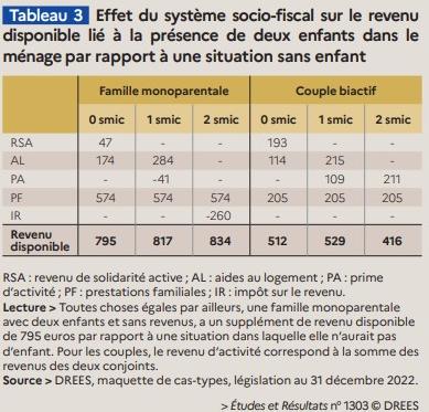 Pour un couple ayant un revenu d’activité de 2,5 SMIC, le premier enfant majore le revenu disponible mensuel de 172 €, le deuxième de 197 € et le troisième de 323 €. Pour une personne seule touchant 1,25 SMIC, le premier enfant accroît son revenu disponible de 446 €, le deuxième de 306 € et le troisième de 708 €.