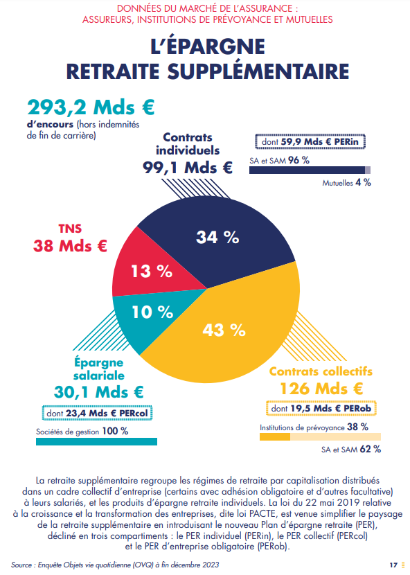 D’après le cahier statistique du CTIP, l’épargne retraite a atteint les 293,2 milliards d’euros d’encours à la fin 2023. Les contrats collectifs représentent une grande partie du marché avec 126 milliards d’euros d’encours, suivi de près par les contrats individuels avec 99,1 milliards (dont 59,9 milliards pour les seuls PER individuels).