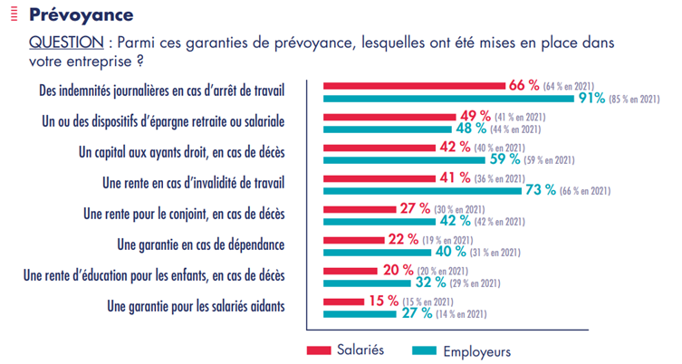 Il est également à noter que le pourcentage d’employeurs déclarant avoir mis en place l’une des garanties de prévoyance dans leur entreprise est en légère augmentation par rapport à 2021.