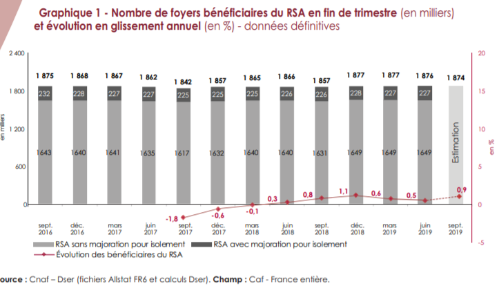 La hausse est moins frappante s’agissant du nombre de bénéficiaires du RSA : 1,87 million de foyers perçoit le RSA fin septembre 2019, soit une augmentation de + 0,9 % en un an. Les foyers perçoivent en moyenne 497 € par mois.