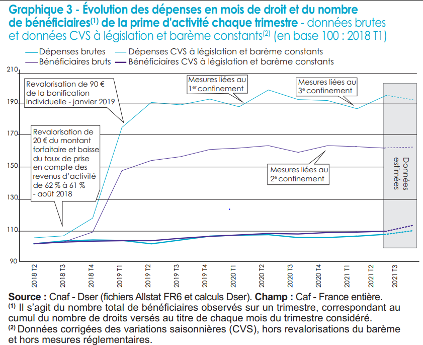 Depuis sa mise en place, le nombre de bénéficiaires de la prime d’activité progresse. Sa mise en lumière a eu lieu fin 2018, début 2019 avec l’annonce de sa revalorisation de 90 €. La crise sanitaire engendre une « évolution en temps de scie » en raison des mesures d’accompagnement décidées par le gouvernement, comme le chômage partiel, et de la situation économique chaotique (diminution de la population active, hausse du chômage). Le nombre de bénéficiaires tend à augmenter en 2021, grâce à la levée progressive des mesures sanitaires et la reprise de l’activité économique.