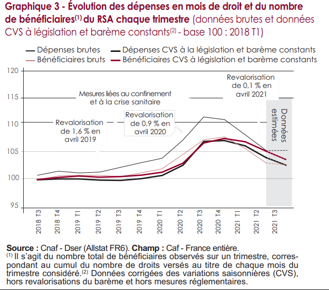 Tout comme la prime d’activité, le RSA est étroitement lié à la situation économique : l’année 2020 connaît de fait une forte croissance des bénéficiaires. Dès 2021, ils diminuent progressivement « avec la mesure exceptionnelle de prolongement des droits à l’assurance chômage et la reprise économique ».